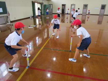 棒・ボール・フープでの遊び方を確認して,用具遊びを楽しみました。