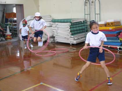 「ボールをパスする時には,柔らかくパスすると友だちが取りやすいと分かりました。」「フープは,腰をくねくねさせるとうまく回りました。」などと振り返っていました。