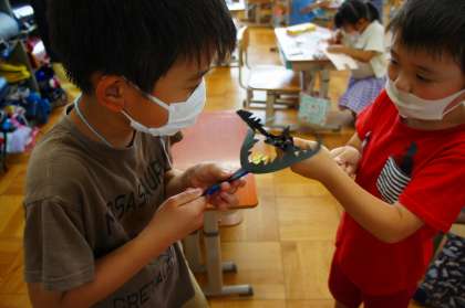 先週作ったストローの仕組みを生かして,動くおもちゃを作りました。子どもたちは,何度もストローの動きを確かめながら,飾りつけをしたり,ストローを組み合わせたりしていました。