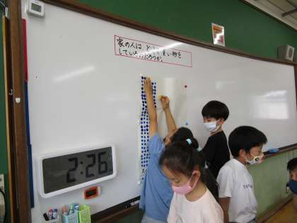 「家の人はどうしてスーパーマーケットに買い物に行くのだろう。」と疑問が出ました。「スーパーマーケットの人が何か工夫をしているのかな。」と予想する姿も見られました。これから調べていきます。