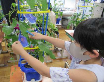 生活科「さかせたいなわたしのはな」の学習で育てている朝顔の花が咲き始めてきました。色とりどりのきれいな花が咲いているのを見て,子どもたちは大はしゃぎでした。