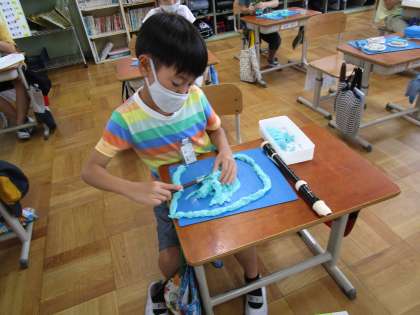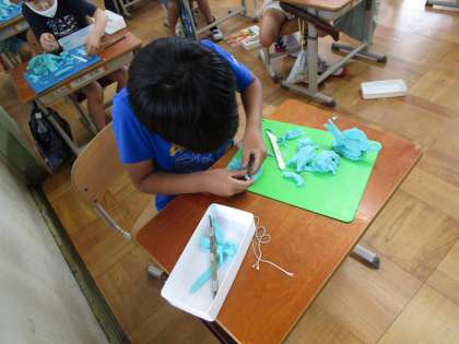 ねん土の塊から,へらを使ってねん土をかきだす感覚を楽しみました。かきだした形や糸で切った形から,思い浮かべて作品にしていきました。