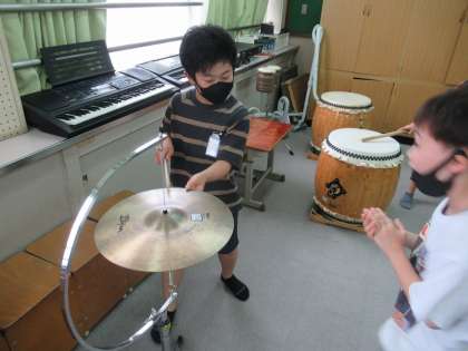 今日は音楽室に行き,打楽器を鳴らして音のふしぎを探しました。音が出るときは楽器が振動することや音の大きさによって振動の仕方が違うことに気が付いていました。