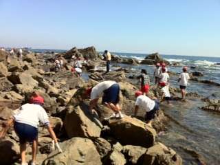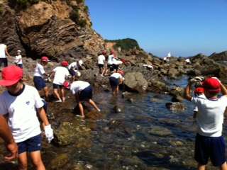 海の生物の学習をした後に磯の観察をしています。バフンウニやヤドカリ、魚など多くの生き物を見つけて大喜びしています。