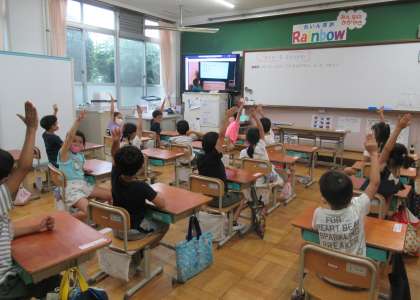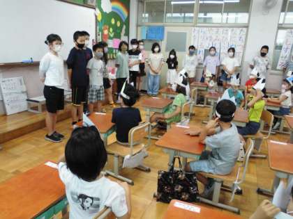 入学してから3カ月が経った1年生。梅小路小学校のお兄さん,お姉さんたちからお祝いがあるよ!と伝えると,とてもわくわくした様子でした。