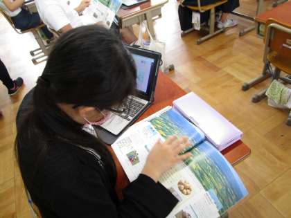 社会科「寒い土地のくらし」では,北海道の十勝平野を取上げ,暮らしや産業について学習しています。十勝平野の広さを写真から感じ取った子ども達。どのようなものが栽培されているのか,資料で調べ,ノートやタブレットにまとめていきました。