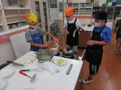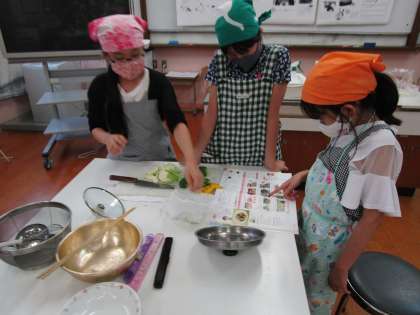 家庭科「おいしい楽しい調理の力」では,ゆで野菜サラダづくりにチャレンジしました。レシピを何度も読み返して手順や分量を確認したり,グループで作業を分担して進めたりと,スムーズに作り上げていく子ども達。できあがったサラダはとてもおいしかったようで,みんなが完食していました!