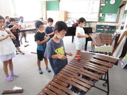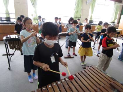 2拍子の拍に乗って,これまでリコーダーで演奏していました。今日は,音楽室で木琴とリコーダーを合わせて演奏しました。マレットの種類によって音色が違うことに驚いていました。互いの音を聴きながら演奏しました。