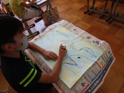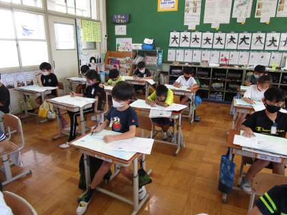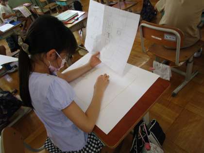 お話を聞いて,お話の言葉から心に浮かんだことを形に表しています。一つ一つ丁寧に描いています。完成が楽しみですね。