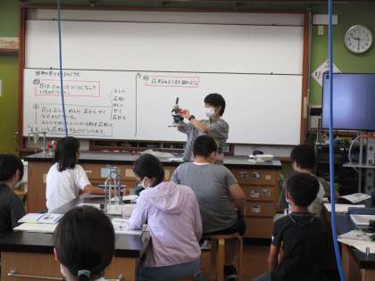 理科では顕微鏡を使って花粉を観察しました。顕微鏡の使い方を真剣に聞く子どもたちでした。