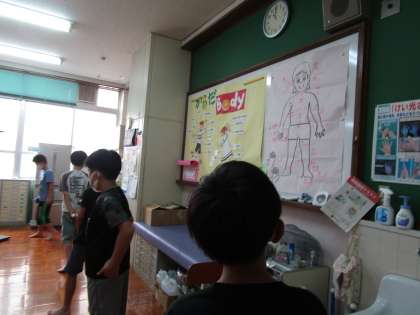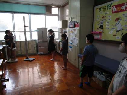9月7日(火)に身体計測を行いました。上靴はきちんと並べ,保健室の中ではソーシャルディスタンスをとる子どもたち。さらに待機中は掲示物を見て学ぶなど,素晴らしい姿勢でした。