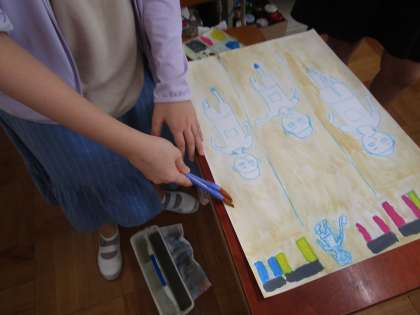 図画工作科「言葉から思いを広げて」では,絵の具を使って自分が想像した場面に色付けしていきました。点描やドライブラシ,ぼかしといった技法を駆使して色づけする子も見られました。