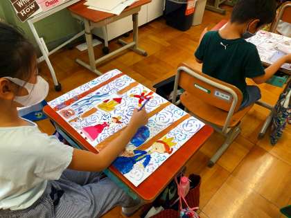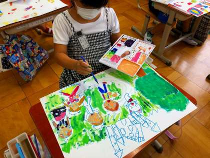 絵の具を使って,思い思いの色を塗っていきます。お話のイメージがだんだんと形になってきましたね。