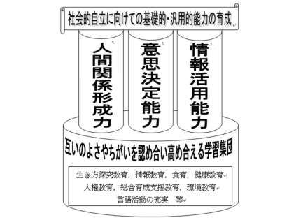 互いのよさやちがいを認め合い,高め合える学習集団のもと,各教科領域,生き方探究教育,情報教育,総合育成支援教育,環境教育等を通してつけていきたいと考えています。