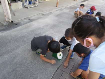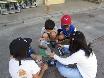 「ランドセルより少し軽いぐらいだと思うよ。」「もう少し入れたほうがいいかなあ。」など,友だちと相談しながら砂を入れていました。