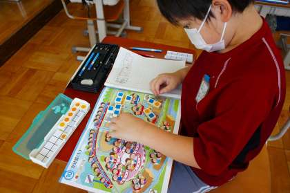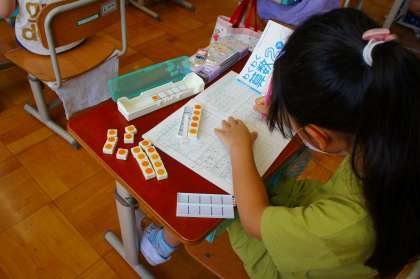 今日はかけ算の学習の導入部分を行いました。絵を見ながら数図ブロックを操作したり,式や言葉で表したりして,「○人の○つ分」という考え方ができるということに気が付きました。