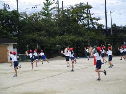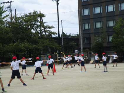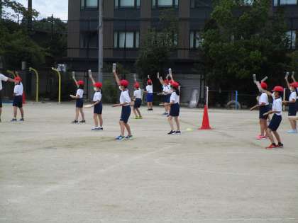体育参観日に向けて,表現「エイサー」の練習に励んでいます。緊急事態宣言が解除されたことで,合同で練習することが可能になりました。運動場で合わせ,本番のイメージをつかむことができました。