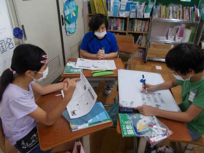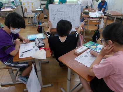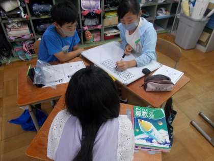 算数科では「表を使って考えよう」の単元を学習しています。パーソナルワークでそれぞれが考えたことをグループワークで交流しました。どのグループも問題を解決するために,表や式の表し方を工夫していました。