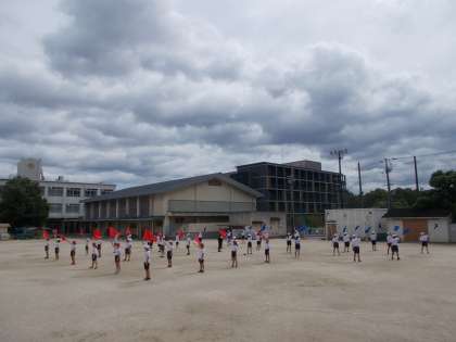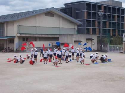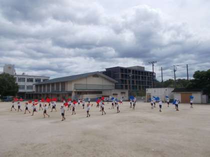 P.E.dayに向けての練習を頑張っています。時差のある動きは列ごとにカウントを取り,全員で揃えるところは学級や学年で息をぴったりと合わせて旗を振っています。本番まで1週間,細部の動きを意識して練習に取り組んできましょう。