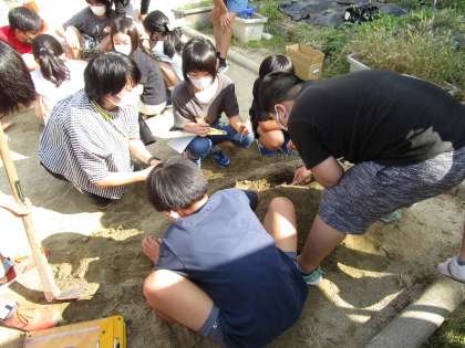理科「流れる水のはたらきと土地の変化」の学習では,流れる水にはどのような働きがあるのかを予想しました。「土を動かす」や「土をけずる」といった予想を立てた子どもたち。その後,砂場で実際に水を流し,どのような変化が起こるのかについて調べました。