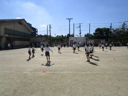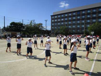良いお天気の中,本番を迎えました。緊張した面持ちでしたが,リズムに乗って元気よく踊ったり,ゴールまで力いっぱい走ったりしました。