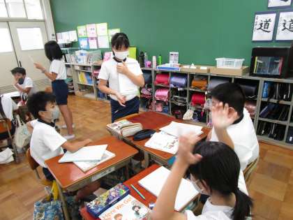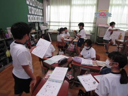 外国語科「He can run fast. She can do kendama.」の学習で,調べた友だちの「できること」と「できないこと」を伝え,誰のことを紹介しているかを当てるクイズをしました。正しく聞きとることで,答えを予測することができました。