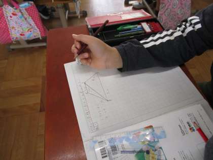算数科「面積」では,台形の面積の求め方を考えました。ひっくり返した台形を並べることで平行四辺形を作り出したり,対角線を引いて2つの三角形に分けたりと,工夫をして求めようとする姿が見られました。