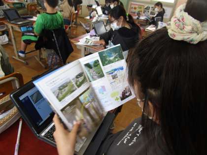 理科「流れる水のはたらきと土地の変化」では,洪水から守るための仕組みについてタブレットを使って調べました。調べたことを交流した後,教科書を使って確かめていきました。