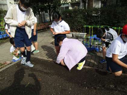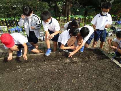梅小路ファームで,こかぶを植える2組の子どもたち。収穫時期が少しずつずれるように,3回に分けてまきました。
