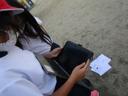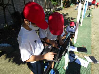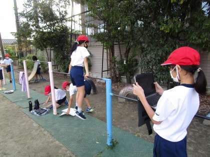 体育科「鉄棒運動」では,タブレットを活用して学習を進めています。タブレットを使ってお手本となる技の動画を見たり,ペアの子の技の様子を録画して見たせたりすることで,修正ポイントを見つけていくことができました。