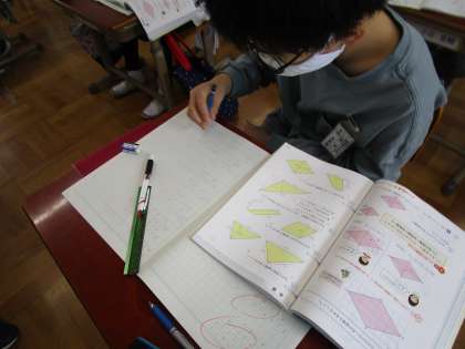算数科「面積」では,面積の練習問題に取り組みました。今まで学習した公式を使って,すらすらと解いていくことができました。