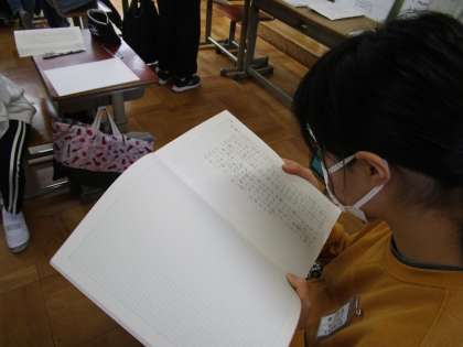 国語科「固有種が教えてくれること」の文章を読んで,筆者の考えに対する自分の考えをノートに書いた子どもたち。「共感する」「同じ」「似ている」「違う」と友だちの意見を分類しながら読み合うことができました。