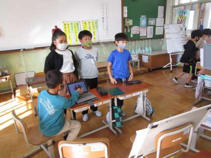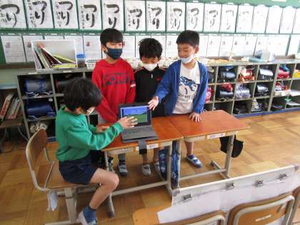 新しく入学してくる1年生に,梅小路小学校のよさを紹介する学習をしています。どのようなものを紹介するとよいか話し合い,グループごとに紹介の練習をしています。