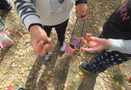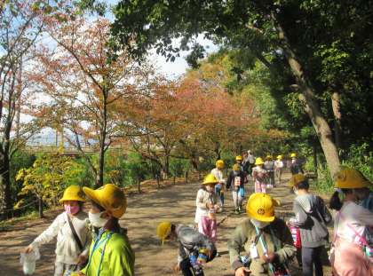 1年生の生活科「あきといっしょに」の学習で,あきみつけをしに梅小路公園へ行きました。朝からとても晴れていて,子どもたちは気持ちよさそうにあきみつけに出かけることができました。一緒に歩きながら秋を探したあとは,自分たちで自由に秋を探しに行きました。