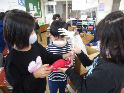 理科で人の体について学習しています。今日は,腕の筋肉について調べました。模型を使って筋肉の動きを確かめているところです。