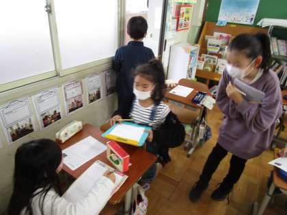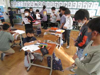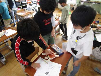 子どもたちの鑑賞カードには,「角の所が動く仕組になっていていいなと思いました。」「長い木と短い木が組み合わせてあって,立体的でいいなと思いました。」など,友だちの作品のよさを見つけたものが見られました。次につくる時に生かしていきたいですね。