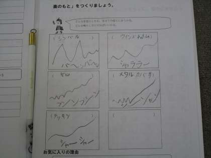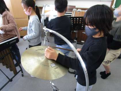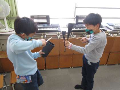 「鉄琴の音をだんだん高くしていくと,まほうがかかる感じがするよ。」「ギロを長くのばして鳴らした後,短く鳴らしてみたよ。」など,工夫したことを交流していました。