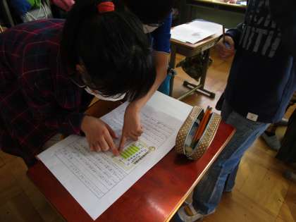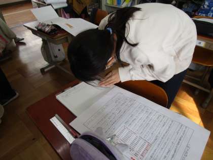 国語科「グラフや表を用いて書こう」の学習では,書いた意見文を交流しました。資料の説明の仕方や考え,その理由など,よかったところをノートに書き連ねていきました。友だちの作品を読むことで,表現や考えの幅が広がったようです。