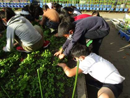 梅小路ファームで育てているこかぶが大きくなってきました。さらに間引いて間隔を確保していきました。