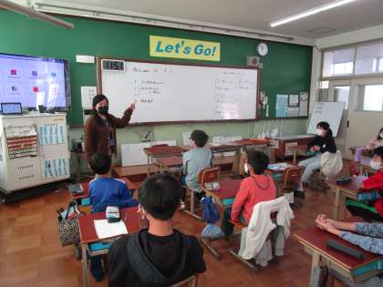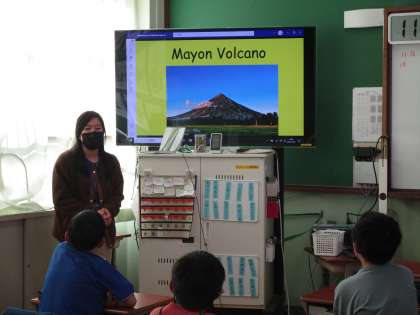 外国語科では新しいALTの先生,フェイ先生が来てくれました。まずはフェイ先生の自己紹介。フィリピンの観光地や名物などと一緒に紹介してくれました。その後は子どもたちの自己紹介。一人ずつ好きなものや得意なことを話しつつ,フェイ先生も好きか得意かを質問することができました。