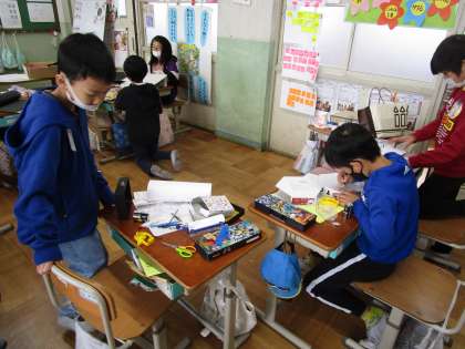 電気の通り道の学習を生かして,おもちゃ作りをしました。事前に設計図を書き,必要な材料を集めておきました。