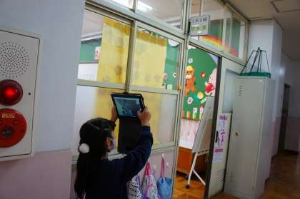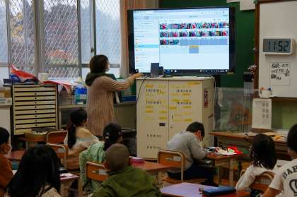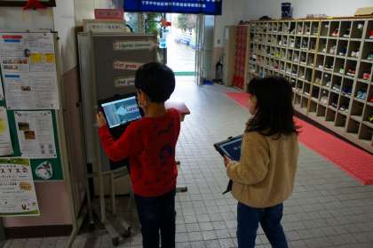 学校の中にも「三角形」や「四角形」はあるのかな?と予想をたて,見つけたものをタブレットPCで撮影して交流しました。