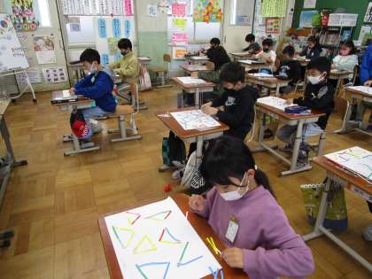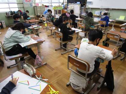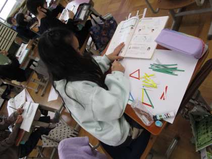 色々な長さの色の棒を色々組み合わせて,三角形を作り,辺の長さに着目しながら仲間分けをしました。「この三角形は二つの辺の長さが同じだね。」「この三角形は,全部の辺の長さが同じだよ。」など,話しながら仲間分けしていました。