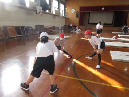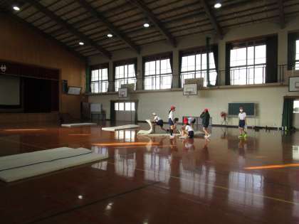 体育科「マット運動」では,グループで協力して学習の場所を作っています。準備できたところから体操をして,体慣らしを始めます。5年生なので,ずいぶんとスムーズにできています。