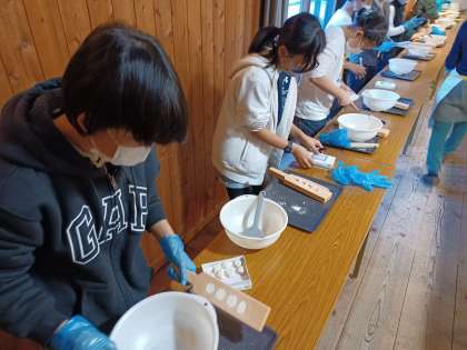 和三盆型押し体験は、和三盆糖に少量の水を混ぜ、型につめて作ります。出来上がりは売り物のお干菓子のようで、ステキです。おうちの方へのお土産ができました。