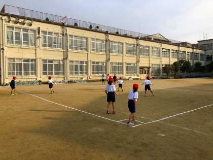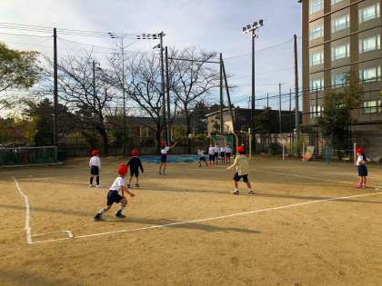 ボールけりゲームの発展で,キックベースボールに挑戦してみました。初めはルールに慣れない子もたくさんいましたが,ハンドベースボールをよくしている子たちが教えてくれたり,自分たちでルールを変えたりしながら,みんなが楽しめるように考えながら進めています。