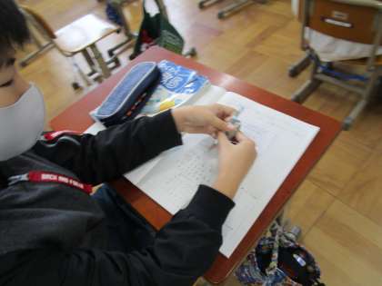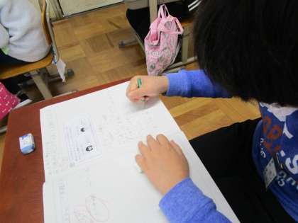 算数科「わくわく算数ひろば」では,切り捨てや切り上げを使って見積の仕方についても考えました。お手本となる文を参考にして,自分で説明することができるようになりました。