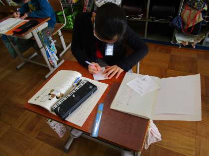 「音楽は 音を楽しむ 学習だ」「学校に 入って 入学 うれしいな」など,漢字の音と訓を使い,リズムと整え作っていました。