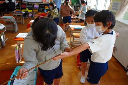 「100cmってこんなに長いんだね。」子どもたちは自分の体の長さと関連付けて考えていました。