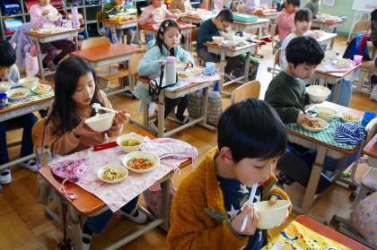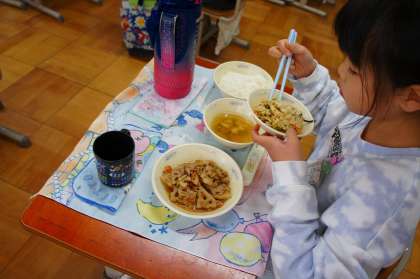 また,寒い季節が旬のれんこんは,豚肉と一緒に甘辛く炊いてあって,ごはんに合いました。すまし汁に入っていた花菜は,春を知らせる京野菜です。少しほろ苦くて大人の味でした。